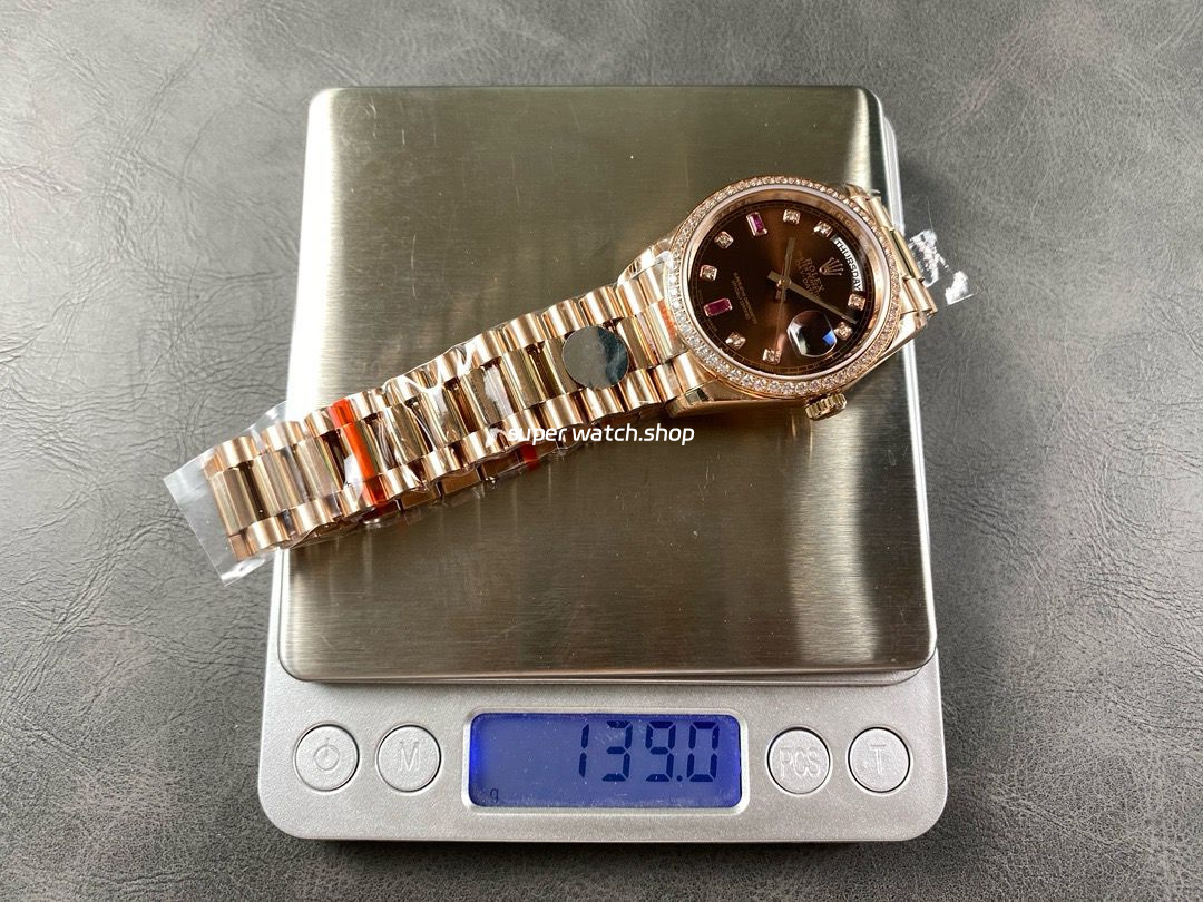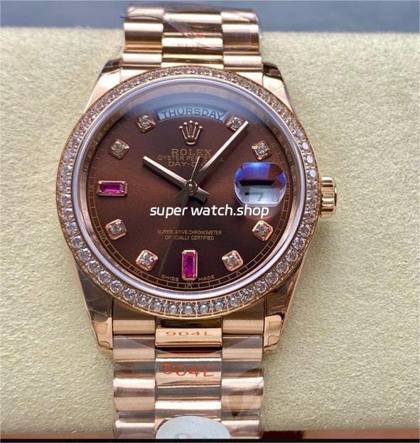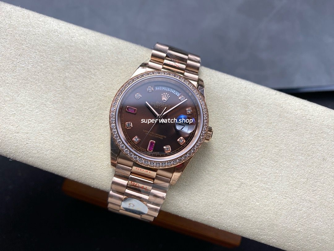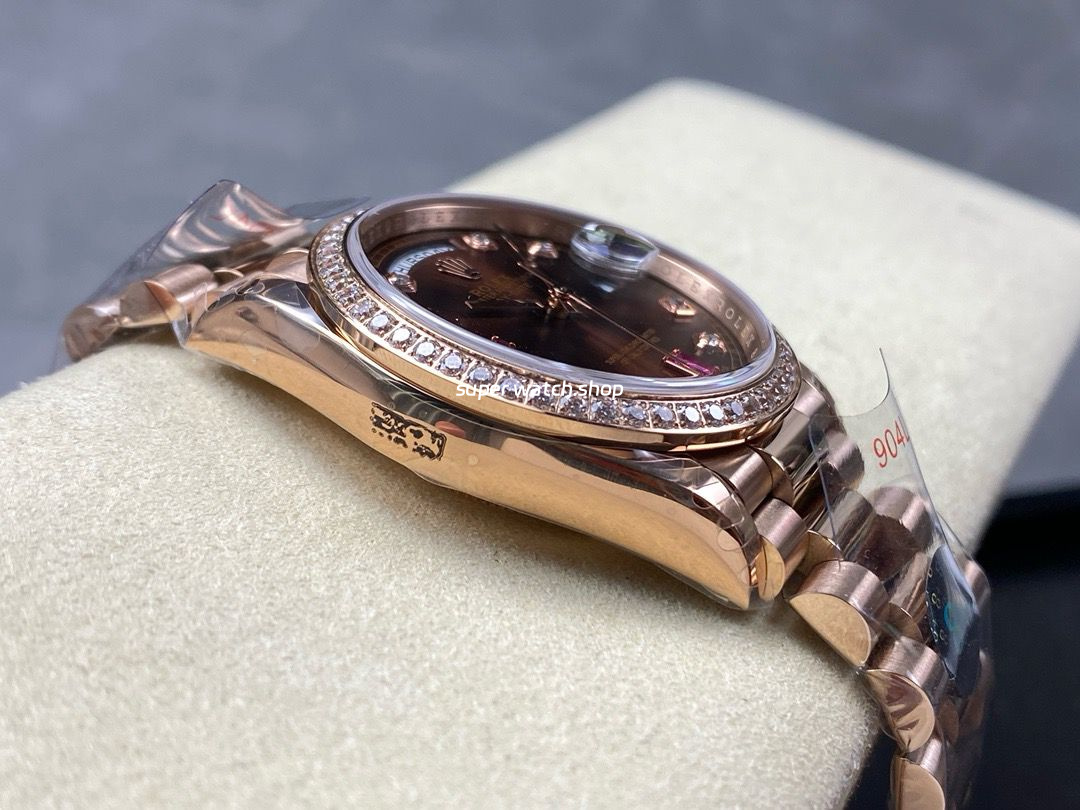 8+ Factory Counterweight Rolex Day-Date 118235 36mm Diamond Rose Gold Bezel Full Rose Gold Diamond Mope&Baguette Diamond Brown Dial