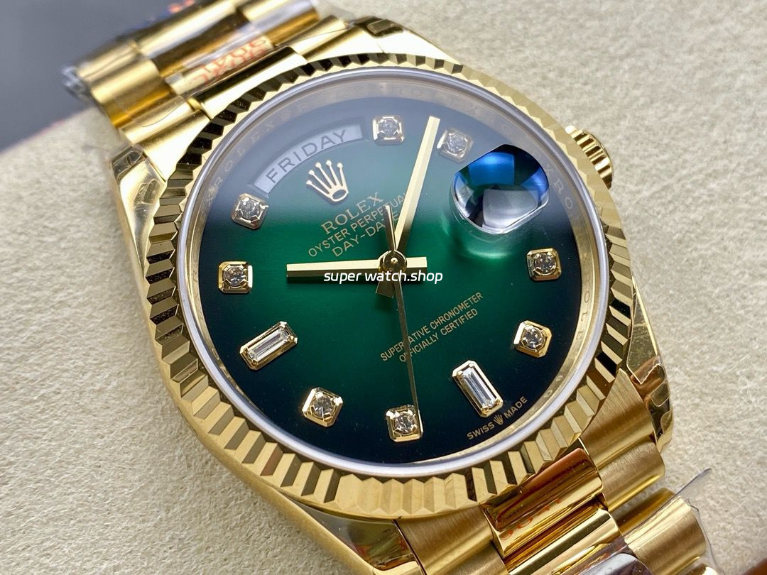8+ Factory Counterweight Rolex Day-Date 128238-0069 36mm Full Yellow Gold Diamond Mope&Baguette Diamond Green Dial