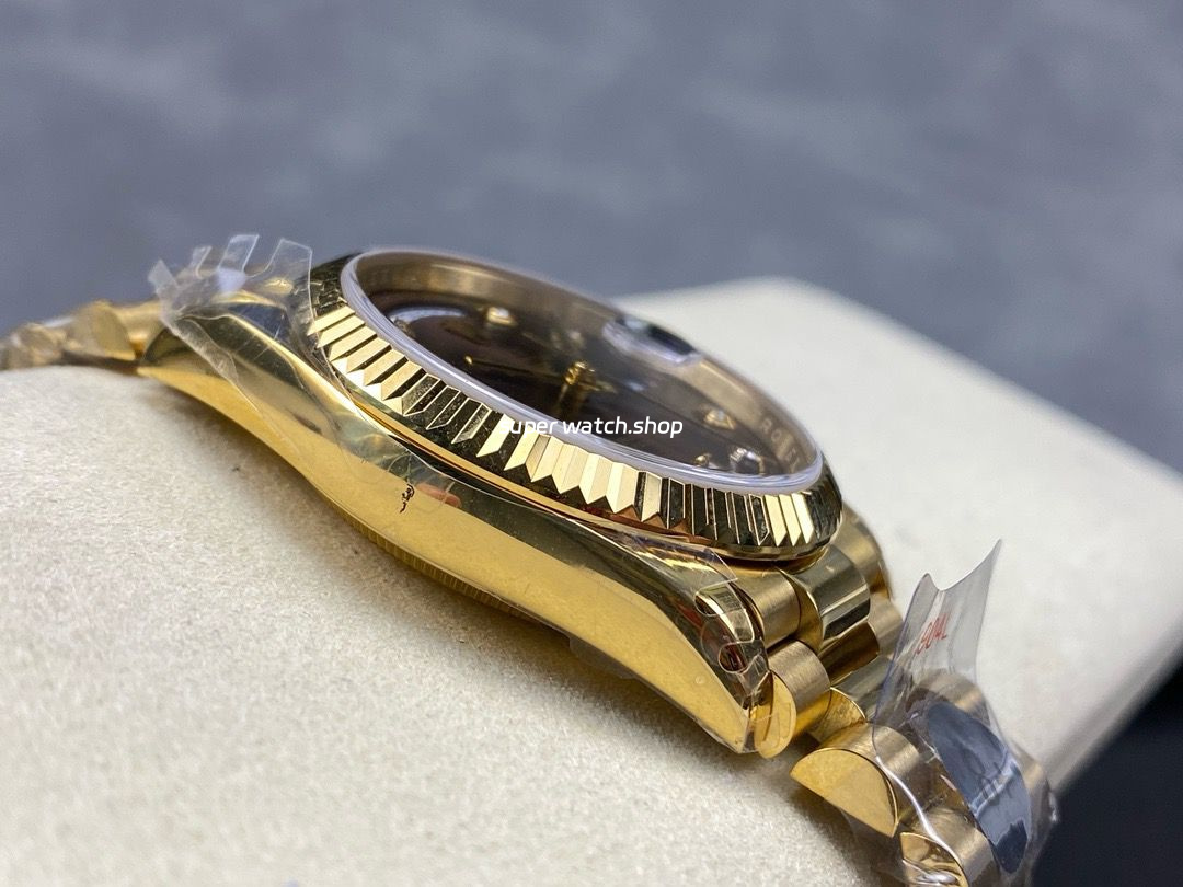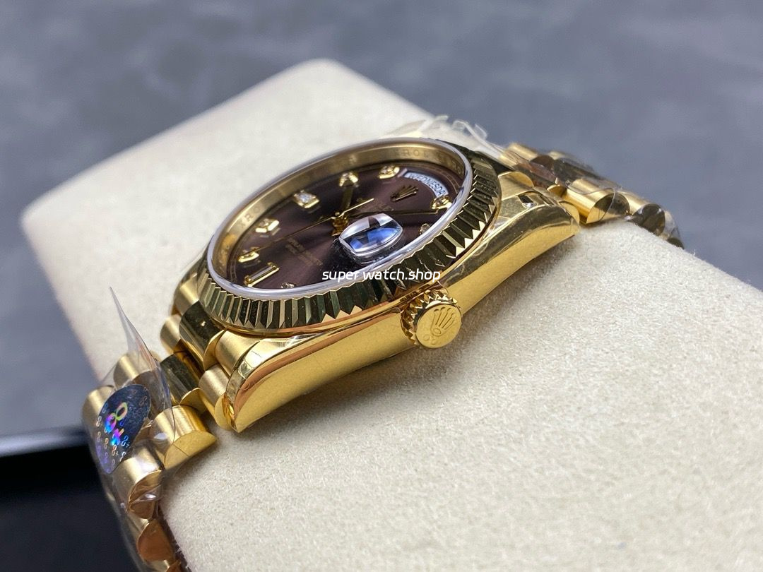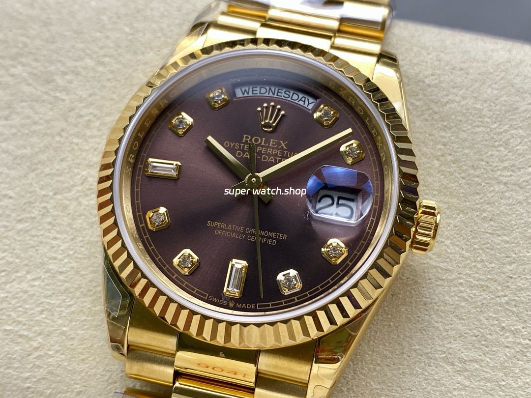 8+ Factory Counterweight Rolex Day-Date 128238 36mm Full Yellow Gold Diamond Mope&Baguette Diamond Brown Dial