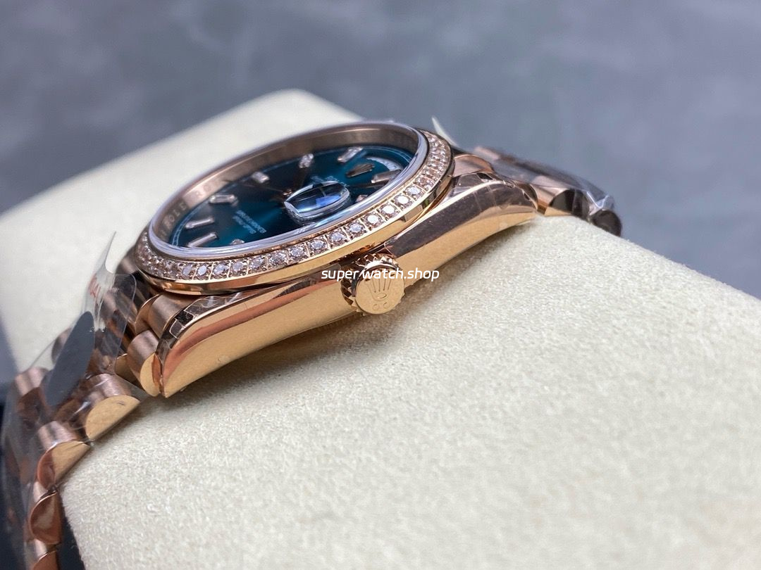 8+ Factory Counterweight Rolex Day-Date 128345RBR-0083 36mm Diamond Bezel Full Rose Gold Baguette Diamond Blue Green Dial