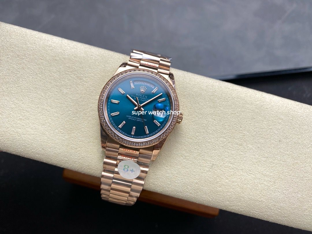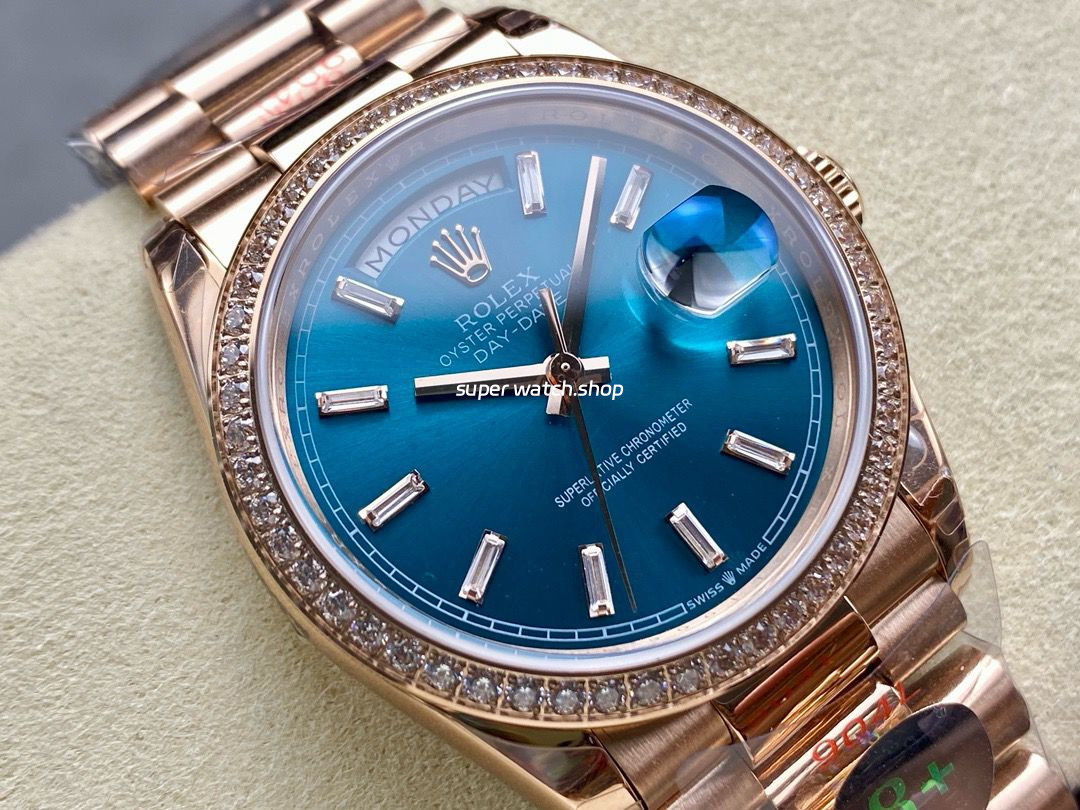 Be the first to review “8+ Factory Counterweight Rolex Day-Date 128345RBR-0083 36mm Diamond Bezel Full Rose Gold Baguette Diamond Blue Green Dial”