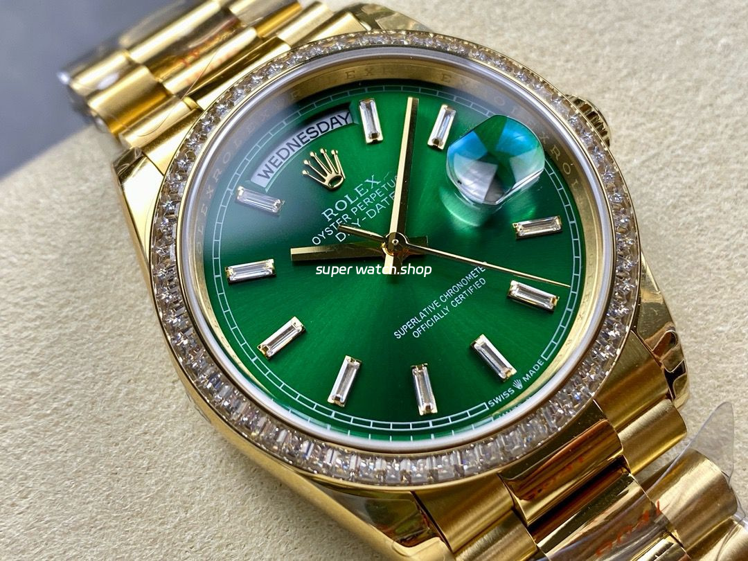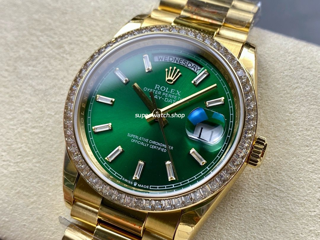 8+ Factory Counterweight Rolex Day-Date 128348RBR-0078 36mm Diamond Bezel Full Yellow Gold Baguette Diamond Green Dial