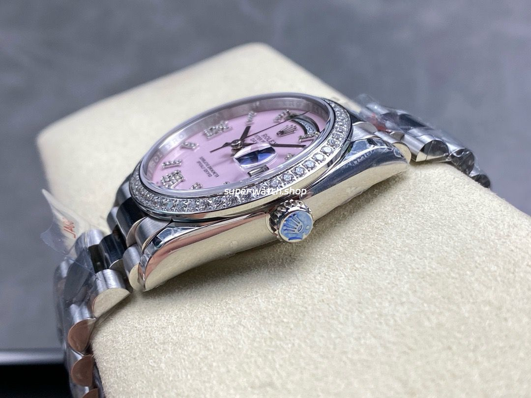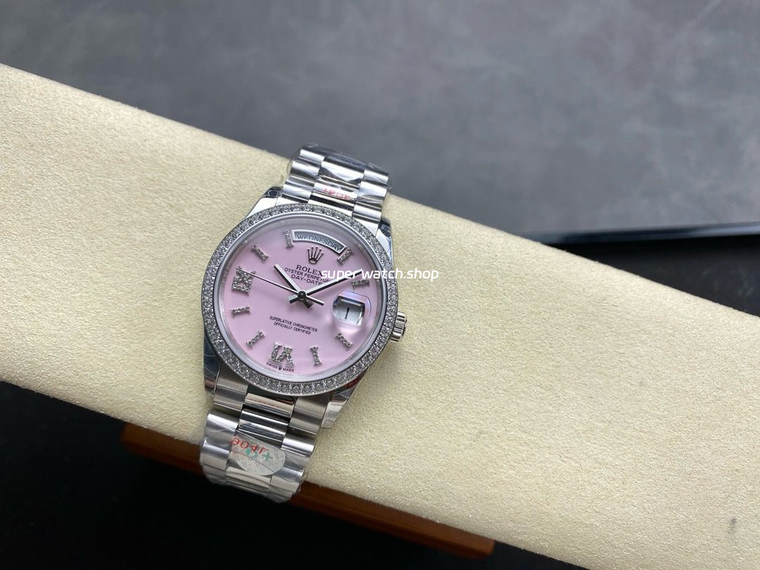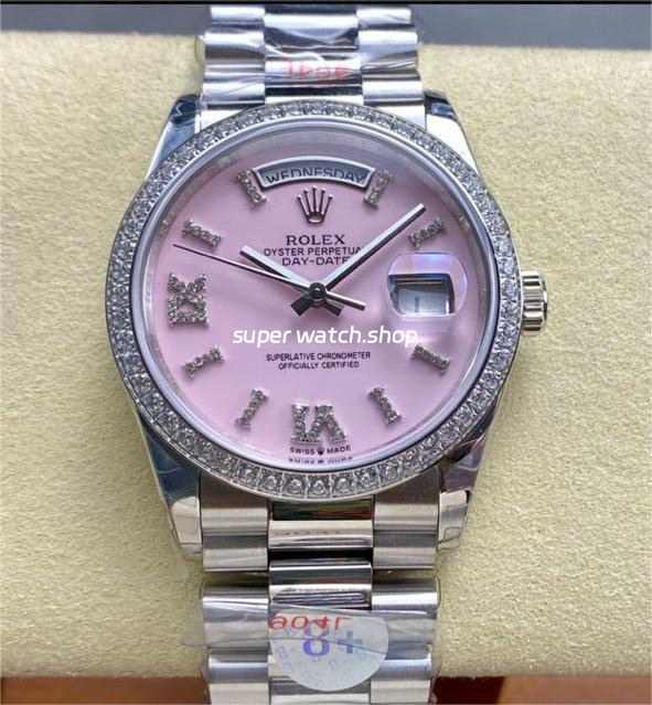 8+ Factory Counterweight Rolex Day-Date 128349RBR-0008 36mm Diamond Bezel Full 904L Roman Number Pink Dial
