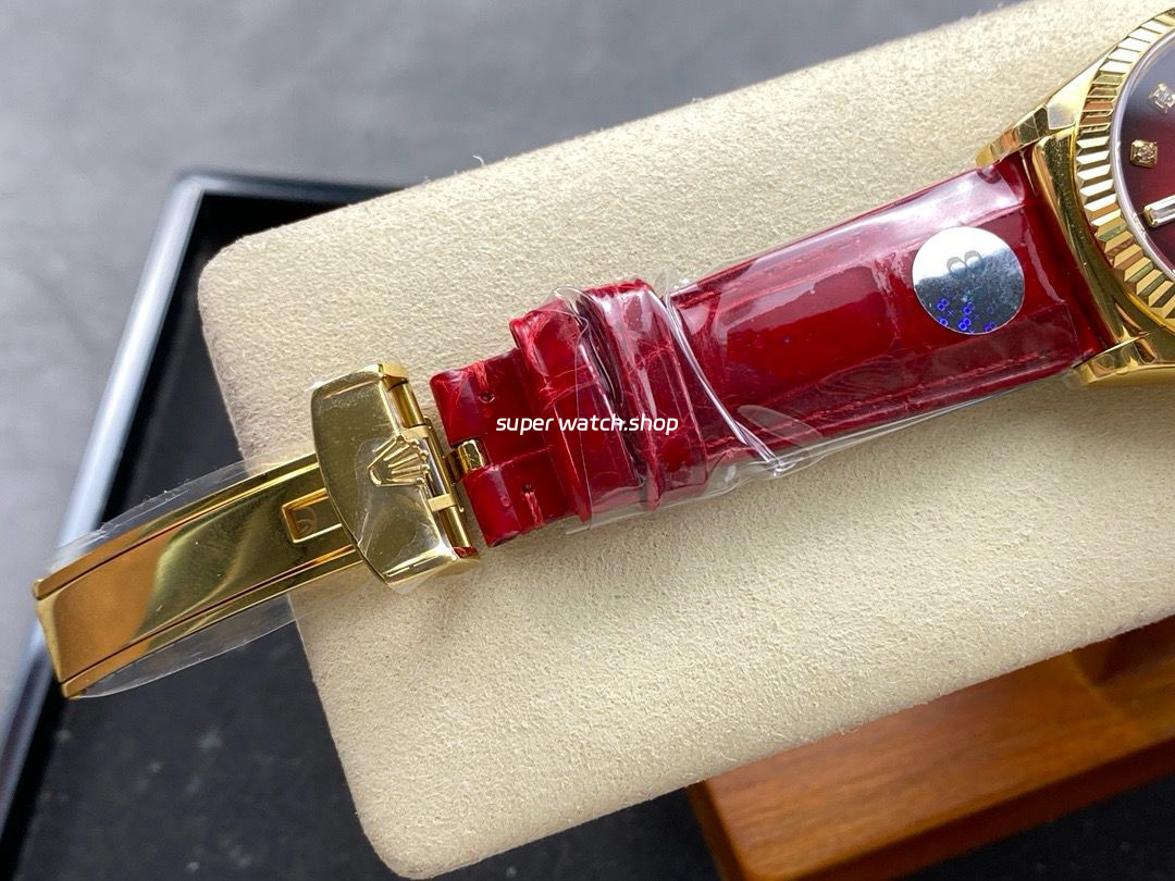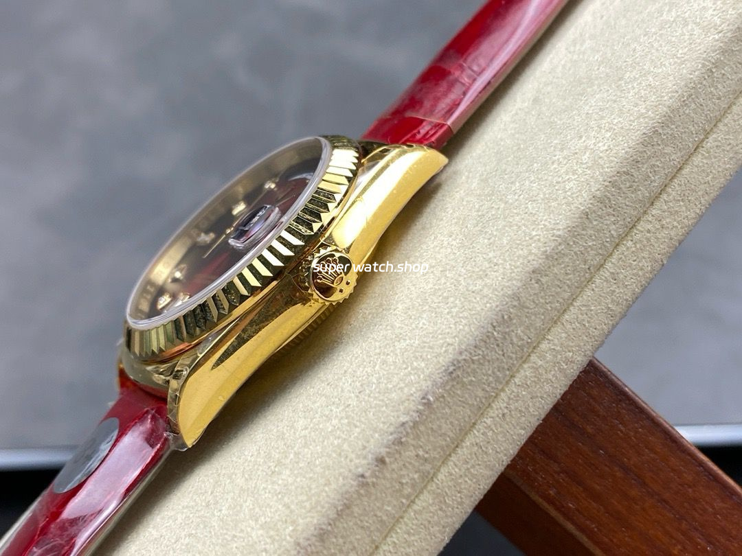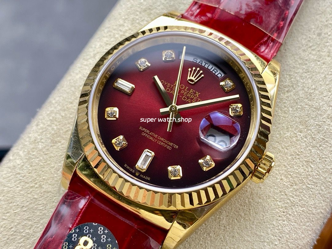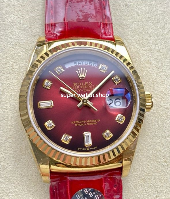 8+ Factory Counterweight Rolex Day-Date 36mm 128238 Yellow Gold Crocodile Leather Strap Diamond Mope&Baguette Diamond Red Ombré Dial