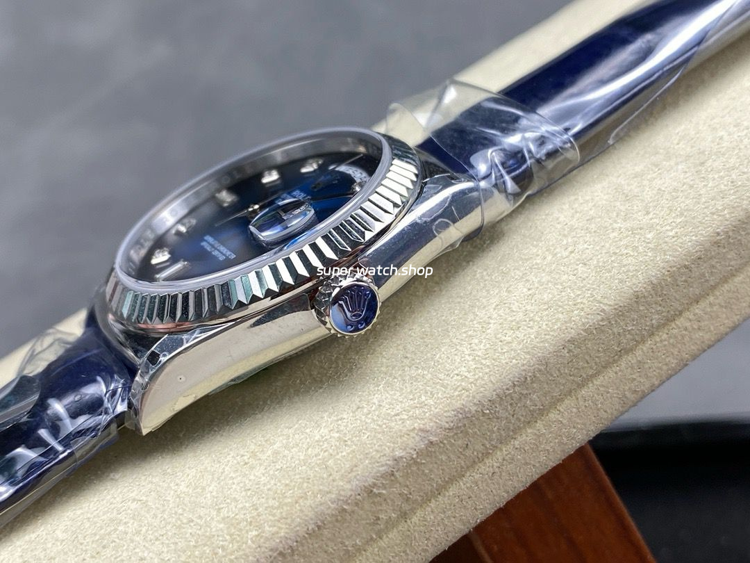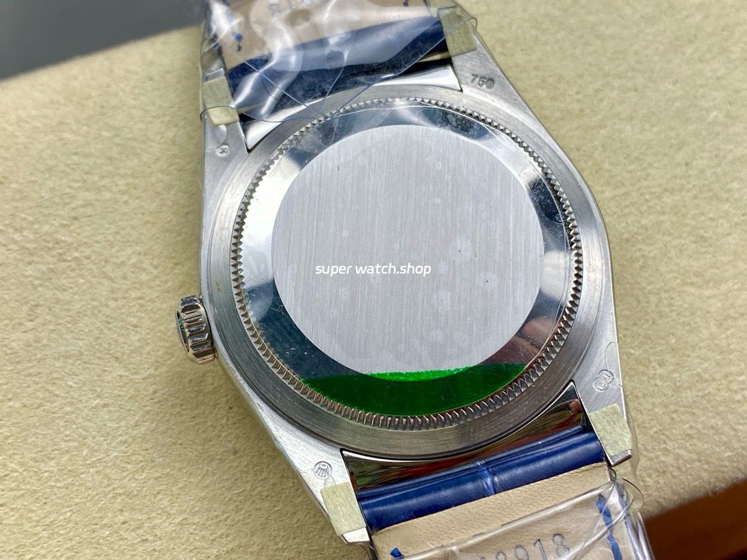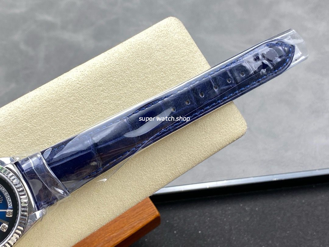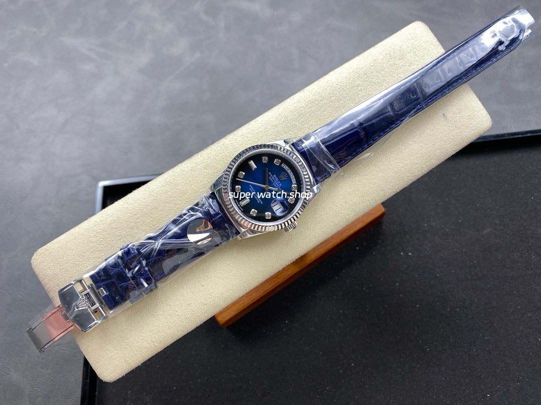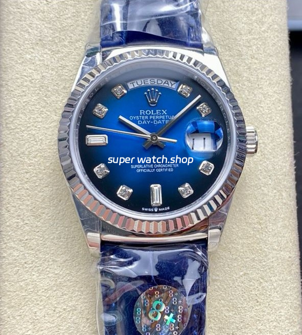 8+ Factory Counterweight Rolex Day-Date 36mm 128239-0023 White Gold Crocodile Leather Strap Diamond Mope&Baguette Diamond Blue Ombré Dial
