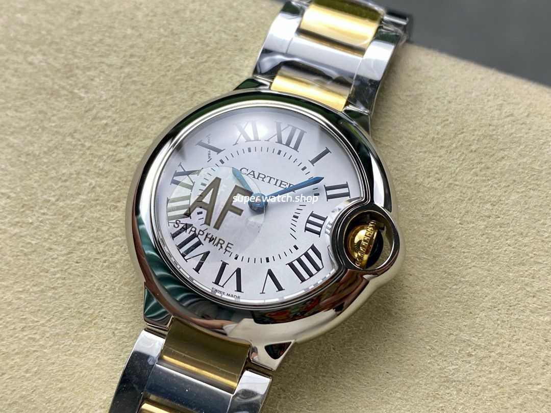 AF Factory Cartier Ballon Bleu W69007Z3 28mm Gold Steel Roman Numerals Silver Dial