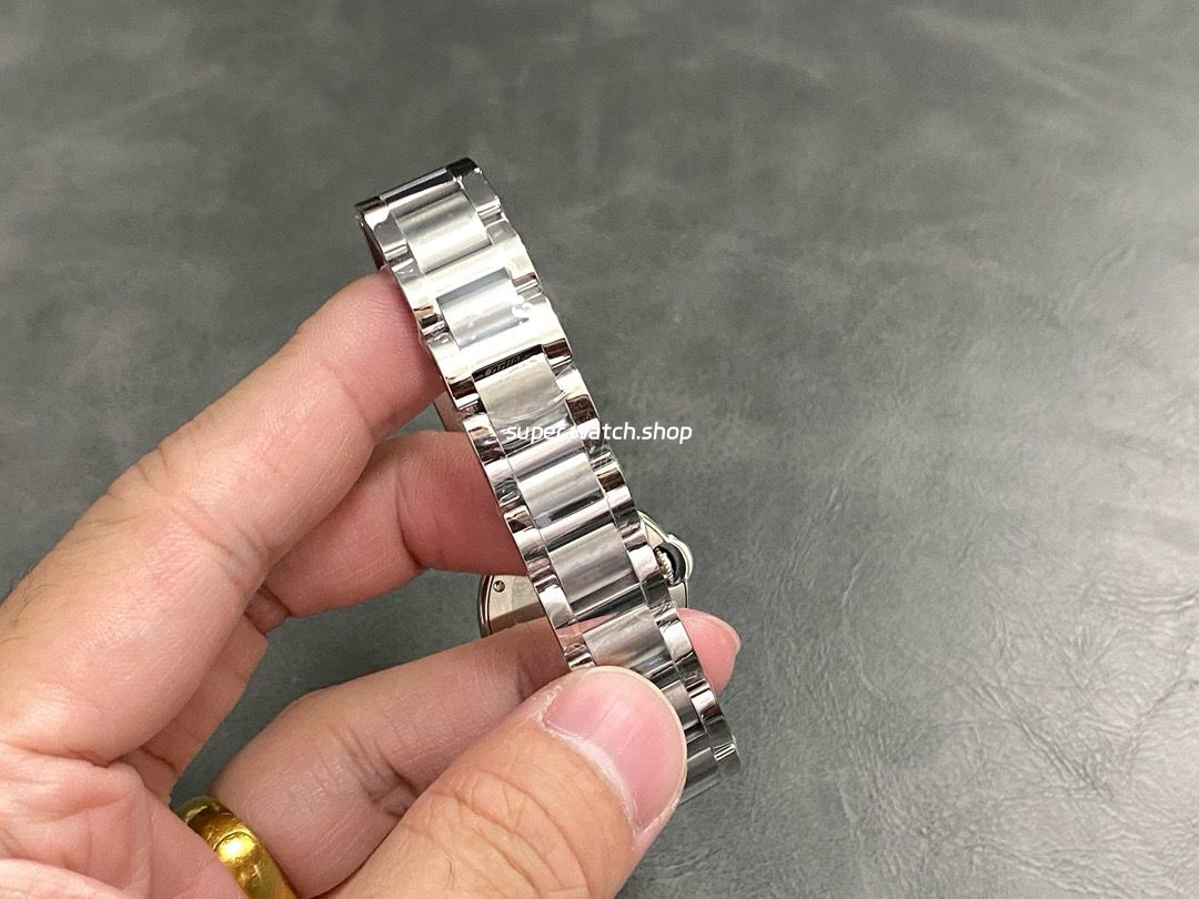 The dial design is a standout feature. This watch boasts a factory-grade silver pearlescent dial, which shimmers with a delicate texture under varying light angles. The Roman numeral hour markers are bold and well-defined, with their size, proportions, and positioning flawlessly matching the original. Paired with factory-grade sword-shaped blued steel hands, the dial captures Cartier’s signature refined aesthetic, with the hands’ rich blue hue giving off a captivating glow.