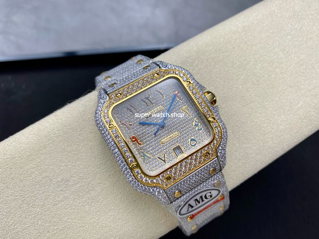 AMG Factory Cartier Full Diamond Santos 40mm Gold Diamond Steel Color Arabic Number Diamond Dial