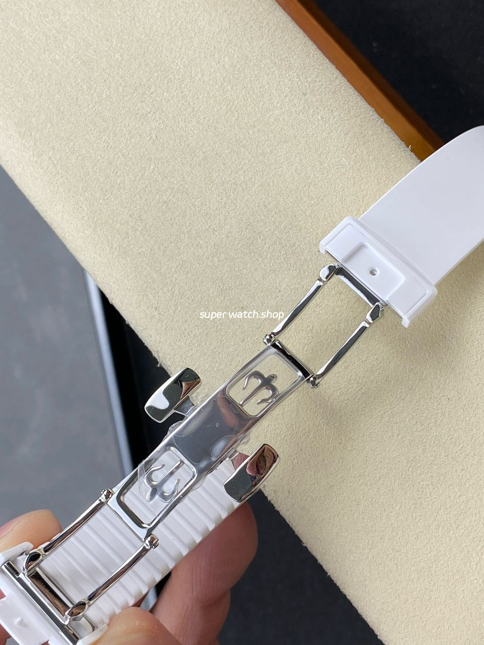 Fitted with a Patek Philippe-style ceramic clasp, showcasing a clean, embossed logo. Elegant, durable, and built to last.