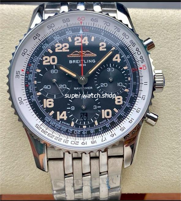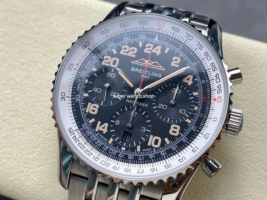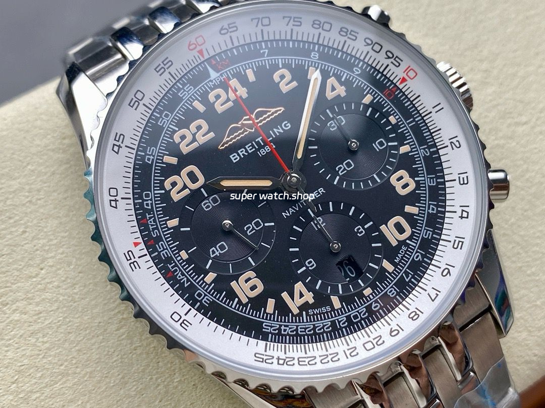 Slide Rule: The outer ring features the iconic circular slide rule, a hallmark of the Navitimer series, designed to assist pilots with in-flight calculations.