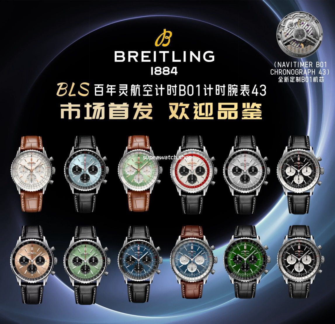 This new Breitling Navitimer B01 Chronograph watch pays tribute to the 70th anniversary of the iconic Navitimer series, blending classic design with bold colors for a fresh interpretation. Here are the detailed features of this remarkable timepiece: