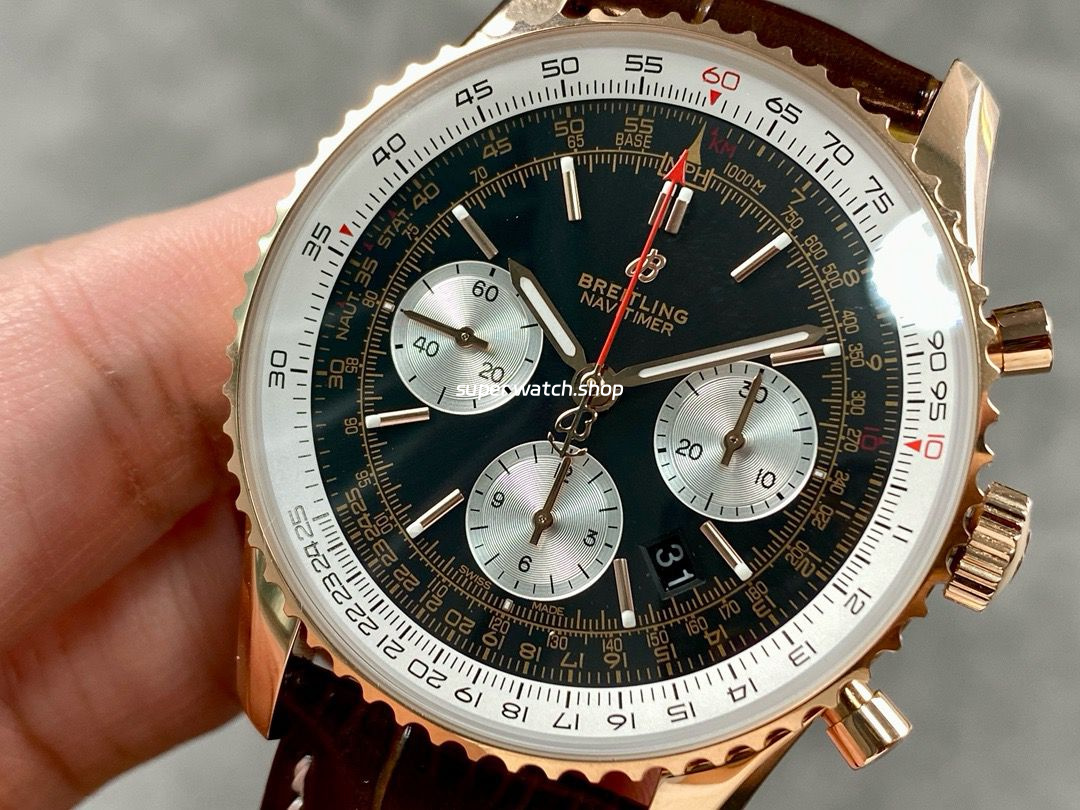 Slide Rule: The outer ring features the iconic circular slide rule, a hallmark of the Navitimer series, designed to assist pilots with in-flight calculations.