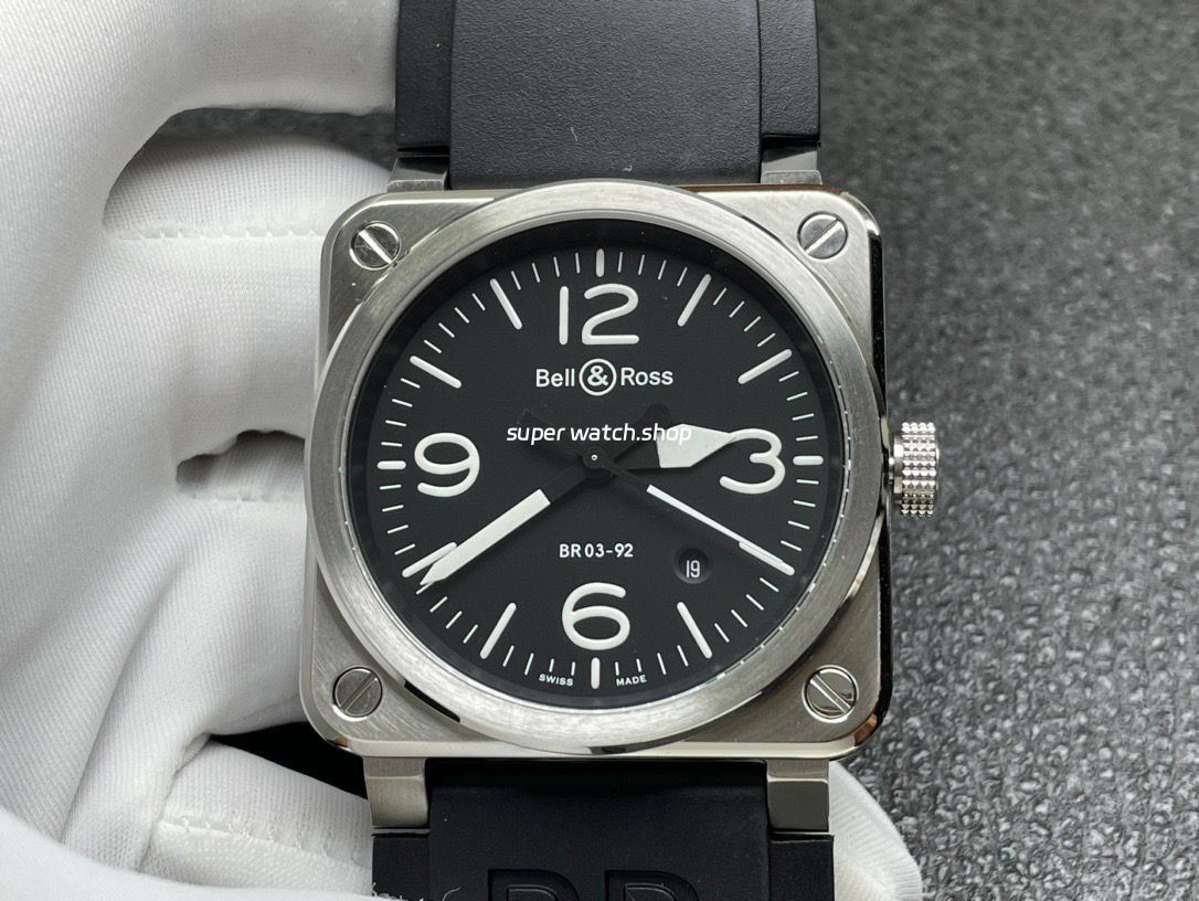 The watch features a 42mm stainless steel square case with sharp, masculine lines, finished with refined brushing and polishing to enhance depth and texture. The classic black dial is designed for maximum legibility, fitted with applied metal numerals and hour markers generously filled with Super-LumiNova® luminous material, ensuring exceptional readability even in low-light or nighttime conditions—true to Bell & Ross’s philosophy of function-first design.