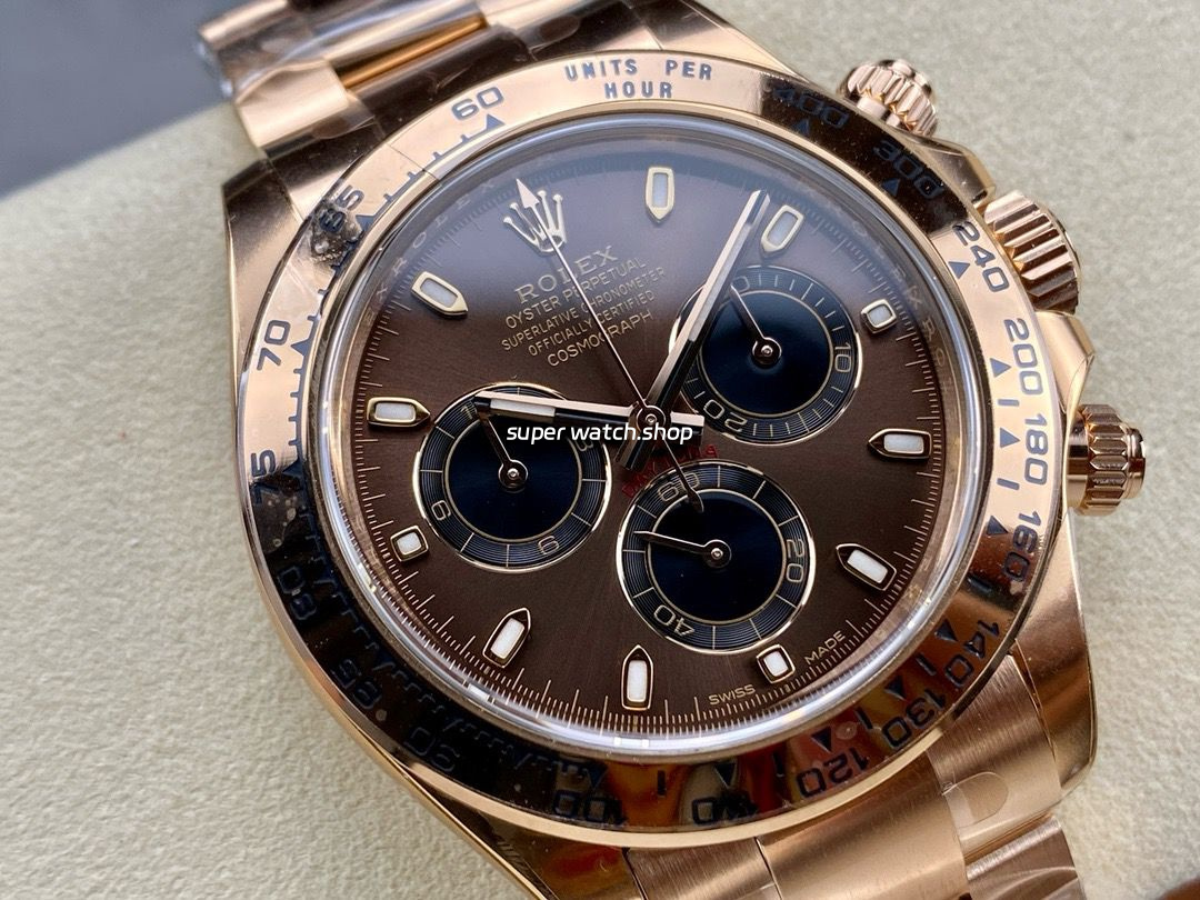 The Clean Factory Rolex Daytona 116505 Everose Gold is one of the finest super clone versions available today. With 904L stainless steel construction, flawless Everose gold plating, and a true 4130 integrated chronograph movement, this watch achieves a near-perfect 1:1 resemblance to the original. A must-have for Daytona enthusiasts who demand premium replica quality.