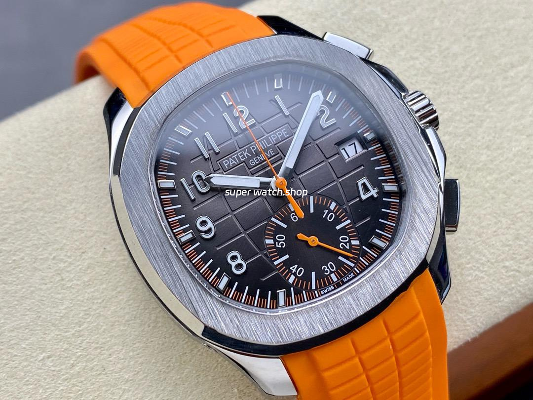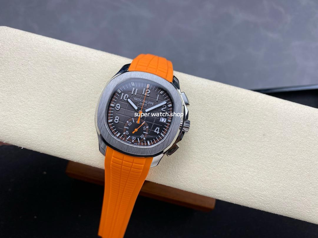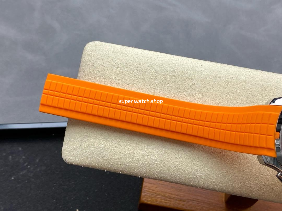 GR upgraded version (thinner) Patek Philippe’s new chronograph grenade (chronograph Aquanaut) 5968A color dial and colored tape. The chronograph seconds hand and scale in the center of the dial and the 30-minute chronograph dial scale and chronograph hands at 6 o’clock are all orange, and the tape is also Orange (the tape is available in black and orange) DAF Philippe CH28 chronograph movement is self-winding, cylindrical wheel, vertical clutch, with flyback function. The 6 o’clock counter has a 60-minute counter and a 12-hour counter. The 60-minute counter is set together (60-minute counter on the outer ring and 12-hour counter on the inner ring). The 6-hour counter at 6 o’clock only has a 60-minute counter and no 12-hour counter.