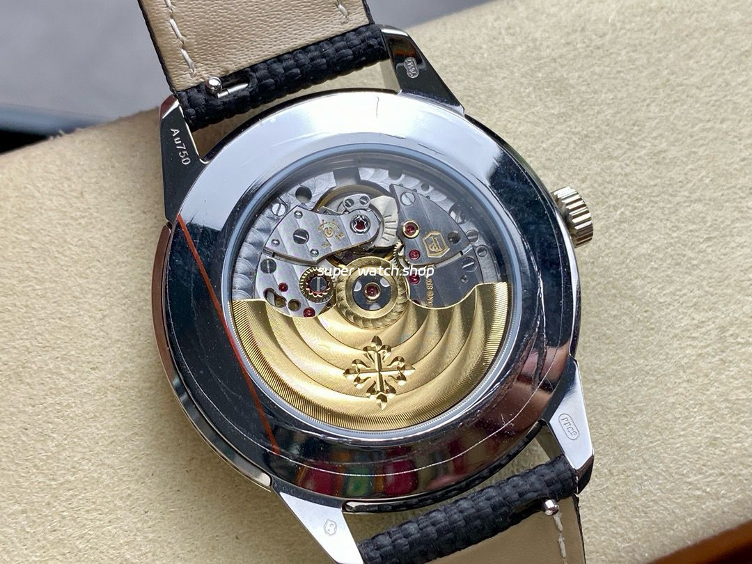 Powered by a modified Miyota 9015 to replicate the Cal. 26-330 S C movement. The bridges are beveled and polished, decorated with perlage and Geneva stripes. Gold-plated engravings and chamfered screw slots enhance the movements authentic finish. Features the iconic double stamp, signifying Patek Philippes signature standard of excellence.