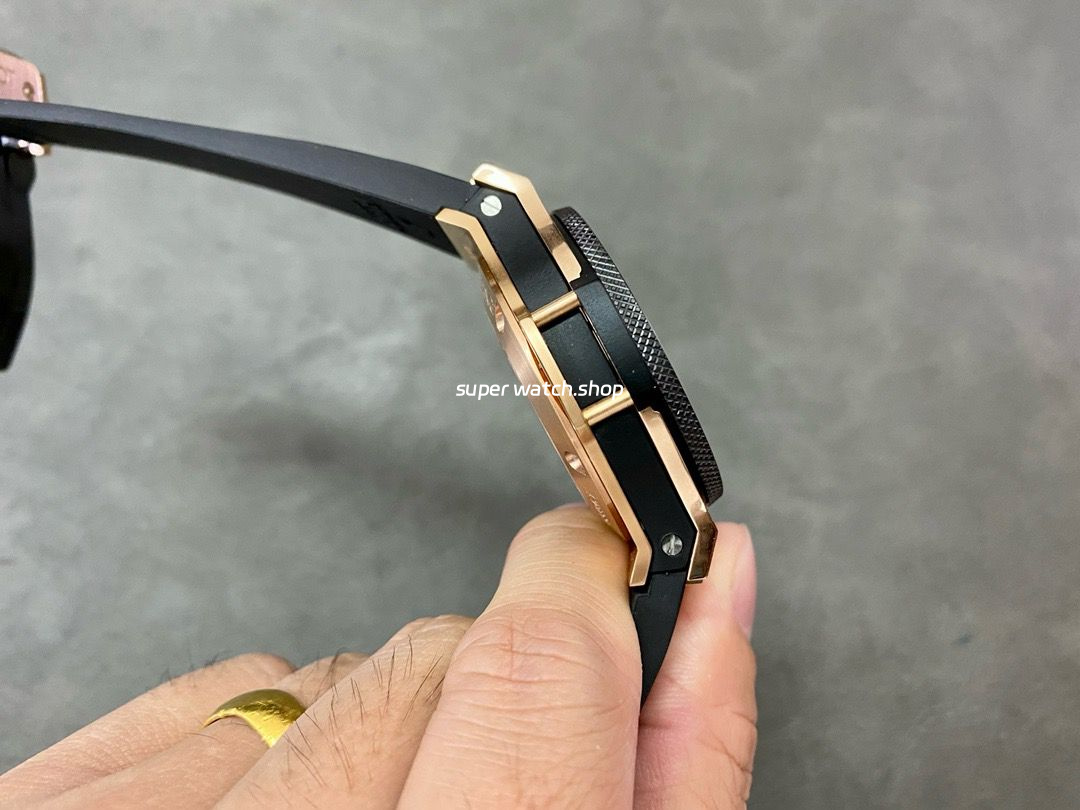 Featuring PVD or rose gold-tone finishing, the brushed texture of the case and black ceramic bezel is well-executed. The carbon fiber-textured dial delivers a striking visual effect.