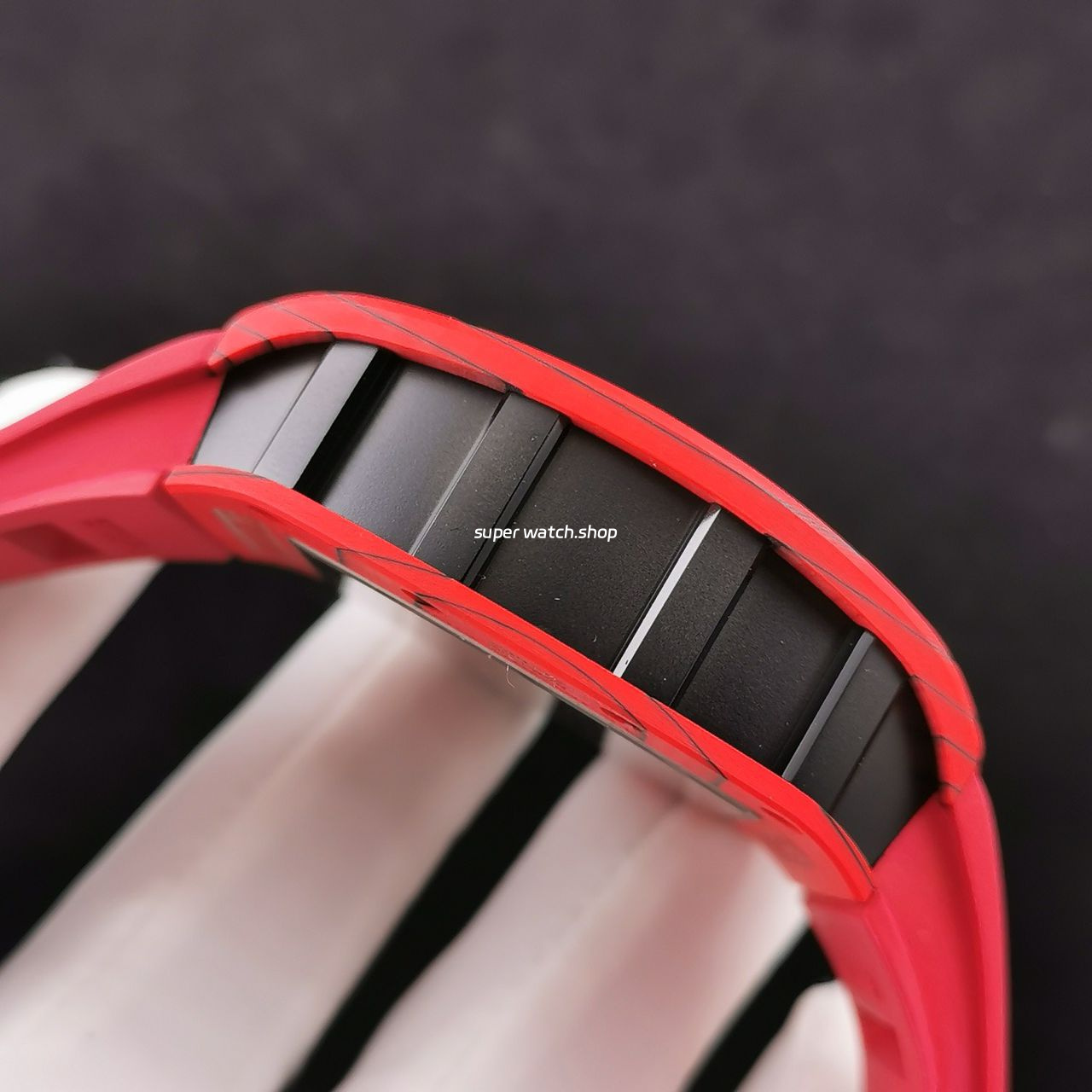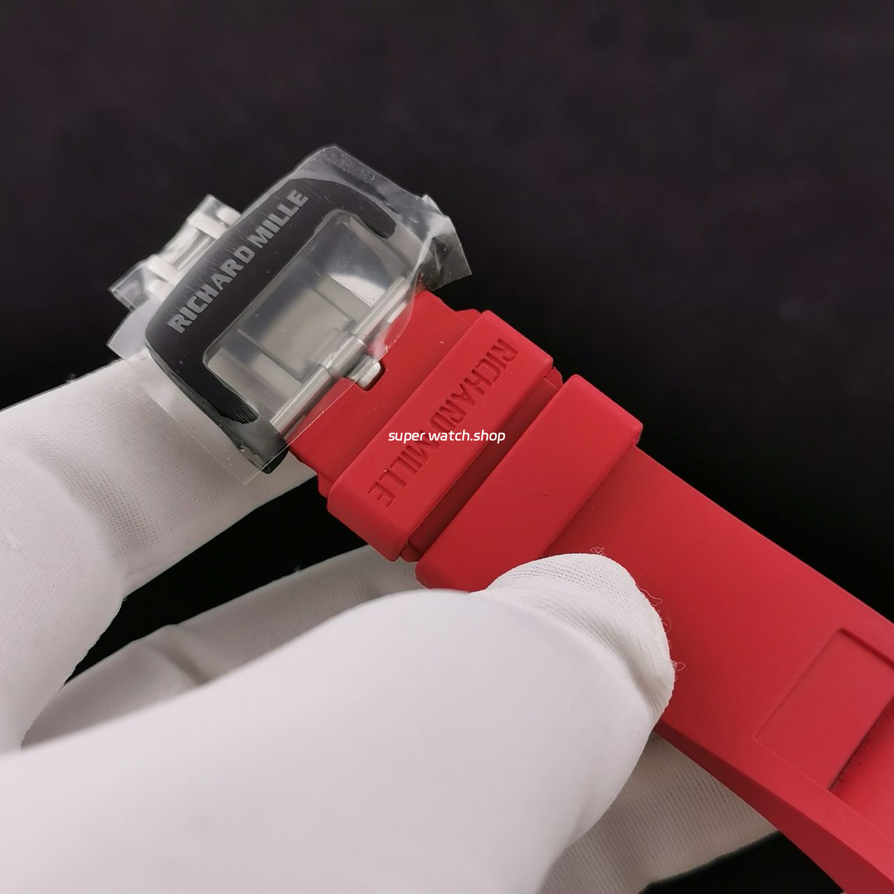 3. The details are in place: the left inner wall of the inner cover of the watch case is stamped with RM052 steel stamp like the original one, the size and depth of the right eye gear are close to the original one, the gem in the center of the forehead is ruddy and clear, the frosted buckle, and the rubber strap imported from Thailand;