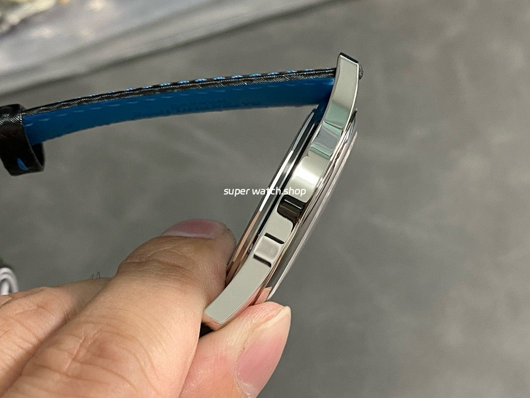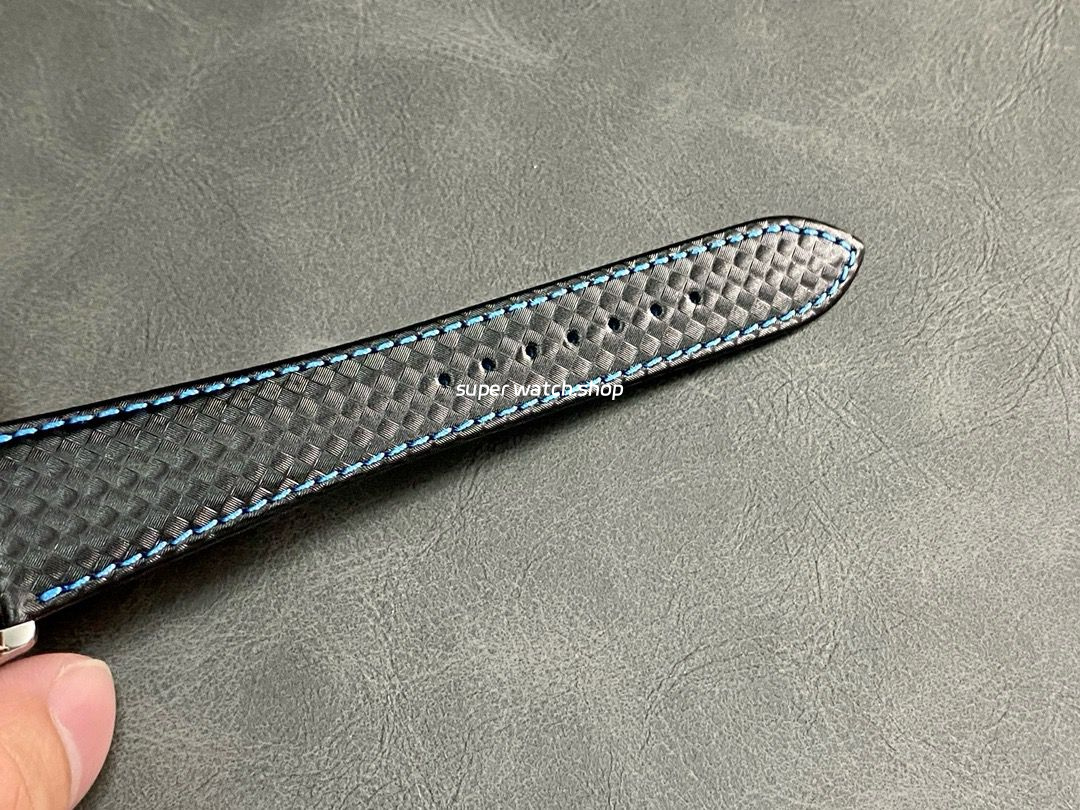 • Craftsmanship: Stitching and lining match the accent colors of the dial, echoing the central “carbon-fiber” pattern.