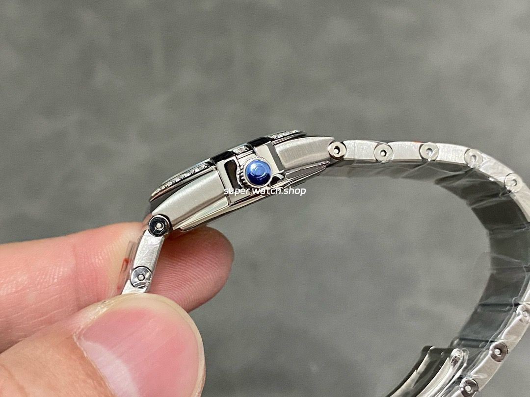 Twelve diamond hour markers are neatly set with precise cuts, closely resembling the fire and brilliance of the original.