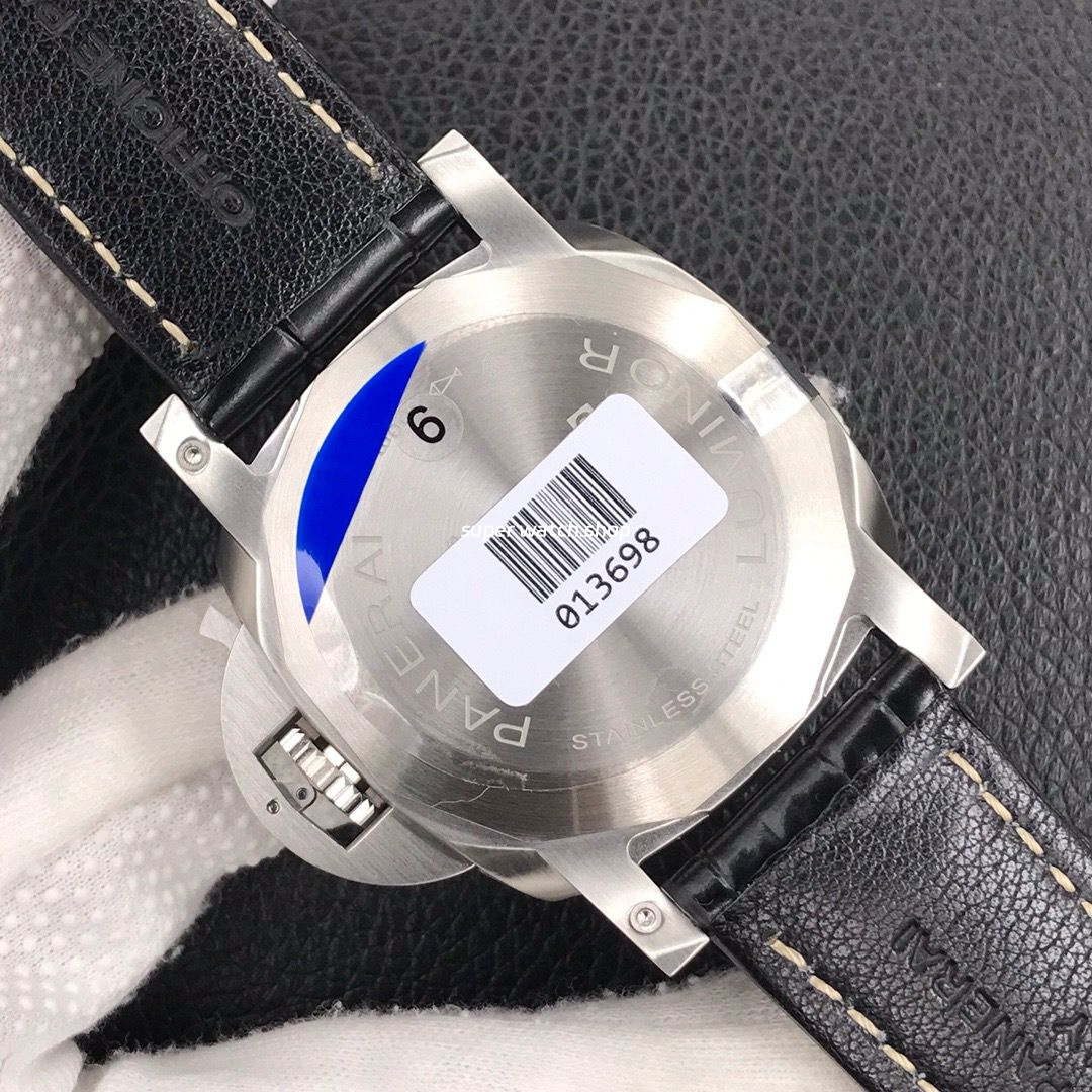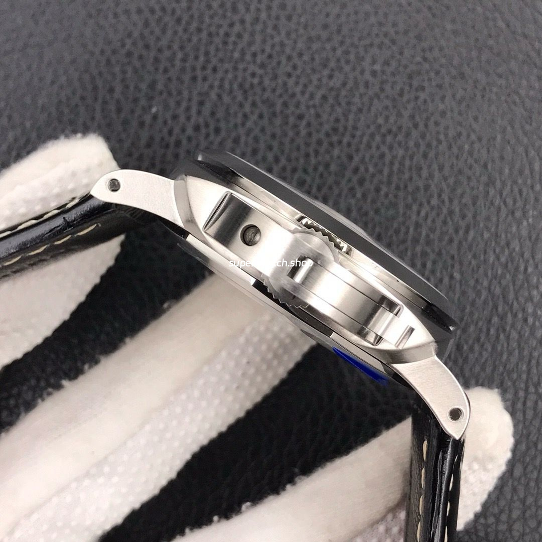 Fitted with a classic brown leather strap in Panerai style, offering a sturdy yet comfortable fit. Completed with a stainless steel tang buckle that is secure and easy to adjust.