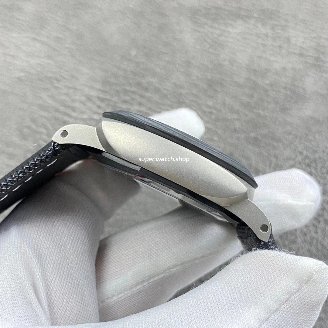 The bezel and crown guard are made from dark carbon fiber, offering a refined contrast to the titanium case. The subtle texture adds depth to the overall design, enhancing the watchs premium appeal and visual complexity.